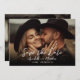 Cartão de Save the Date de casamento Boho Chic Minimalista Simples. Este design mais escuro, inspirado no estilo rústico, apresenta fotos horizontais em página inteira na frente e no verso, ideal para casais que buscam uma estética elegantemente casual ou de fazenda. Um gradiente preto na parte inferior de cada lado desaparece na foto, criando um contraste elegante para o texto em caligrafia manuscrita branca. A frente inclui "Save the Date", juntamente com os nomes do casal, data do casamento e localização. O efeito gradiente pode ser removido para uma aparência de imagem mais limpa e natural.