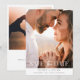 Um cartão de convite de casamento com modelo de duas fotos minimalista moderno com texto sobreposto branco e nomes/detalhes em uma fonte cinza sem serifa.