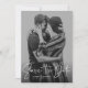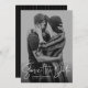Com uma foto vertical solteiro e um roteiro moderno escrito "salve a data", este cartão é a maneira perfeita de anunciar seu noivado e o próximo casamento para amigos e familiares. O texto branco é ousado e moderno, mas ainda sofisticado. O texto personalizável na frente tem espaço para nomes, data, local e outras informações como um site de casamento. O fundo é um padrão listrado preto e branco. A cor preta é editável clicando em "Personalizar".