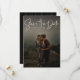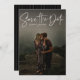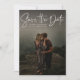 Com uma foto vertical solteiro e um roteiro moderno escrito "salve a data", este cartão é a maneira perfeita de anunciar seu noivado e o próximo casamento para amigos e familiares. O texto branco é ousado e moderno, mas ainda sofisticado. O texto personalizável na frente tem espaço para nomes, data, local e outras informações como um site de casamento. O fundo é um padrão listrado preto e branco. A cor preta é editável clicando em "Personalizar".