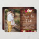 Cartão de 'Save the Date' com foto em madeira de celeiro, flores boêmias de Borgonha e Marsala. Design de casamento com arranjo floral botânico de rosas cor-de-rosa em aquarela, folhas verdes sobre fundo de madeira de celeiro marrom. Apresenta uma tipografia elegante e manuscrita 'Save the Date'. Escolha perfeita para casamentos de outono ou inverno. #3335