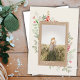 Desenho botânico de flores silvestres em torno de cartão inspirado em retângulo com texto branco e sua foto personalizada. Fundo bege claro.