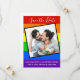Este cartão ousado de Save the Date com arco-íris apresenta uma foto de engajamento LGBTQ romântica e personalizada para um casal gay ou lésbica que ama anúncios brilhantes e coloridos. Personalize este cartão fotográfico alegre de Save the Date LGBT com seus nomes, data e local.