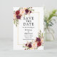 Elegante Watercolor Burgundy Floral Save O Cartão de Anúncio de Casamento de Noivado de Data inclui rosas de burlagem, rosas cor-de-rosa, rosas vermelhas e verde botânico numa armação de ouro.