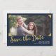 Salve o cartão de data com as palavras "Salvar a data" em uma fonte de script na moda e uma borda elegante de quadro em ouro azul escura contra um fundo azul escuro. A placa inclui um lado traseiro correspondente. Personalize-o substituindo o texto do marcador de posição e substitua a foto do marcador de amostra/marcador de posição por sua própria foto. Para obter mais opções, como alterar a fonte e seu tamanho, clique no botão "Personalizar". *Observe que a Marca d'água do Zazzle que aparece na visualização de zoom NÃO aparecerá no produto impresso final. © Rosewood e Citrus
