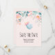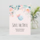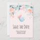 Guarde o cartão de ponto com uma imagem fofa de uma garrafa de bebê azul-clara com uma jante rosa. Uma borda floral rosa e verde adiciona um toque de elegância.