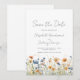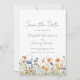 Este design rústico boho apresenta uma borda de aquarela de flores silvestres laranja e azuis ao longo da parte inferior. As palavras "Salve a Data" e os nomes do casal aparecem em elegante letra manuscrita cinza carvão, com o texto restante em fonte sans serif em um fundo branco.