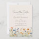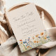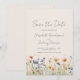 Este design rústico boho apresenta uma borda de aquarela de flores silvestres laranja e azuis ao longo da parte inferior. As palavras "Salve a Data" e os nomes do casal aparecem em elegante escrita à mão em cinza carvão, com o texto restante em fonte sans serif em um fundo bege.