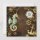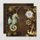 Fundo de madeira castanho com fundo marinho, cordilheira mecânica, volante antigo, âncora de ouro e diversas engrenagens de ouro e latão. Estilo Steampunk.