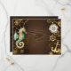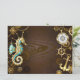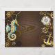 Fundo de madeira castanho com fundo marinho, cordilheira mecânica, volante antigo, âncora de ouro e diversas engrenagens de ouro e latão. Estilo Steampunk.