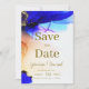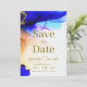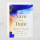 Este cartão de salvamento surpreendente apresenta um modelo fácil de editar onde você pode adicionar os nomes da noiva e do noivo e a data do casamento. Tanto a frente como a parte traseira da placa exibem os nomes do casal em uma fonte elegante de script manuscrito. A fonte serif complementar adiciona um toque formal, mas amigável, ao design geral. Gemstone Blue & Orange Salve a data.