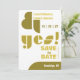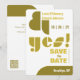 Alegria, criativa, divertida, um pouco engraçada e definitivamente uma declaração, esta tipografia geométrica moderna salve o cartão de data e diz a todos os seus amigos e família que você disse "sim!" Esta versão tem fundo branco com acentos de abacate e verde-oliva e mostarda. Os cantos arredondados do cartão complementam as formas geométricas do cartão. Mostrada no estoque de cartonagem branco normal, mas a opção de Papel branco Felt irá adicionar à vibração retrorreflectora. Frente: Um painel geométrico, casais, a data, "sim!" em uma legal fonte geométrica, "Salve a Data", e a cidade e o estado. Fundo: fundo branco com formas geométricas coordenadas, espaço para uma mensagem adicional e um código QR para o seu website de casamento. Parte da nossa coleção Bushwick com o nosso tema de cor de ginkgo. Coordenar os convites e os acessórios de correspondência disponíveis.