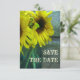 Um casamento outono salva a data com uma foto próxima de um pote de girassóis sobre um fundo de madeira de galha. Personalize o texto na frente e atrás.
