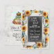 Os perfeitos Save The Dates rústicos para a estação do outono! Madeira de celeiro desgastada e quadro-negro são acentuados por girassóis festivos e abóboras de colheita em estilo aquarela. Tema de casamento único e especial para envios de outubro e novembro.