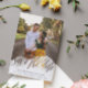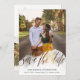 Lindo e único cartão de save the date com uma sobreposição de gossamer com save the date cortado para que sua foto apareça em uma linda escrita espiralada. Adicione outra foto no verso junto com os detalhes do seu casamento.