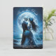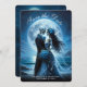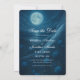 This elegant gothic wedding save the date announcement flat card features a skeleton couple wearing blue wedding attire in a romantic setting with the moon and ocean behind . The back of the your wedding details. Image generated with AI.