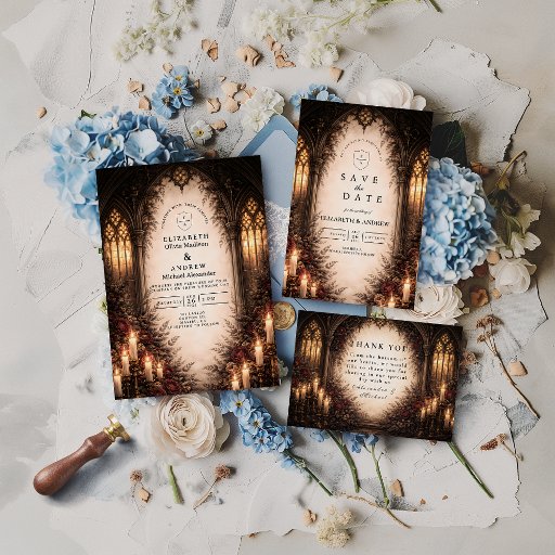 This dramatic wedding design features a moody gothic cathedral setting illuminated by soft candlelight. Arched windows, rich florals, and glowing candles create a romantic, old-world atmosphere inspired by historic chapels and dark botanical elegance. The deep, warm tones and ornate details make this design perfect for couples drawn to timeless romance, mystery, and a refined gothic aesthetic.