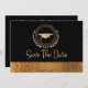 Eu gosto de projetar arte para formandos. Este é o ouro clássico moderno e elegante e preto com aquarela dourada Salve o cartão de anúncio Data. Texto de estilo moderno. Adicione a sua própria mensagem no verso dos cartões, dando detalhes à sua família e amigos para salvar a data de uma cerimônia de graduação, evento, festa ou outra ocasião. O estilo de logotipo design inclui folhas de louros, estrelas e um boné de formatura.