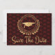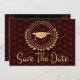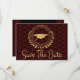 Eu gosto de projetar arte para formandos. Este é um estilo de deco de arte maravilhoso e único com elegante ouro clássico, preto e vermelho. Salve o cartão de anúncio Data. Texto de estilo moderno. Adicione a sua própria mensagem no verso dos cartões, dando detalhes à sua família e amigos para salvar a data de uma cerimônia de graduação, evento, festa ou outra ocasião. O estilo de logotipo design inclui folhas de louros, estrelas e um boné de formatura. Parabéns ao formando.