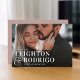 Anuncie sua data de casamento com esses cartões salve a data ousados e modernos baseados em tipografia. Design apresenta uma foto horizontal ou orientada a paisagem para solteiro de sangramento de cheio, com seus nomes sobrepostos em letras brancas unidas por um e-mail sobredimensionado. Personalize com a data e o local do casamento e adicione detalhes adicionais às costas, se desejado.
