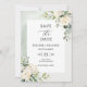 Esta é uma bela moda Salve o cartão de data apresenta folhagem verde e eucalipto fresco com rosas brancas - flores de primavera marcam a caligrafia do rico. Vender a coleção de cheios com este design.