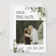 Verde moderno Salve o cartão Data com espaço para sua foto na frente, enquadrado pela elegante folhagem de cor d'água eucalipto. A parte traseira inclui um código de QR digitalizável para acesso fácil ao seu site de casamento ou detalhes. Apresentando um esmeralda clássico e uma paleta de sábios, este design é perfeito para casamentos de primavera ou verão e coordena-se lindamente com a suíte de estacionamentos de eucalipto de cheio.