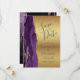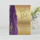 A borda esquerda deste elegante casamento moderno salve o cartão de data apresenta uma borda de agata púrpura aparada com falso brilho dourado. O texto personalizável combina a escrita manual de cinzas de carvão, fontes em copperplate e itálico em um fundo de folha de papel azul. O verso apresenta um design de agate roxo e dourado correspondente.