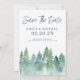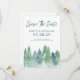 Nosso estilo rústico sonhador salva o anúncio do noivado da data, apresenta uma floresta de pinheiros verde-eetéreo, pinheiros, com roteiro manuscrito, emparelhado com um texto rústico em uma fonte antiga serif, para um estilo romântico de natureza romântica e arrogante.