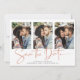Manuscrito Salve a data Rosa de Cobre Dourado Múltiplo Cartão com fotos em um tipo de letra elegante e que evoca uma sensação romântica manuscrita. Na parte de trás há veias do estilo folha de ouro de rosa da empresa em moda que correm através de mármore clássico. Projetado para usar três de suas fotos favoritas para personalização adicional. Adicione facilmente seus nomes e datas para um design verdadeiramente personalizado.