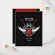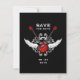 Anuncie o seu casamento com este cartão de Salve a Data não convencional em estilo rock and roll com guitarras de rock elétricas vermelhas cruzadas, asas e ornamentos vintage em preto.
