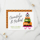 Casamento de Halloween Salve a data com bolo de casamento cor laranja, preto, rosa e verde, aranha, noivado e coração. Tipo de script manuscrito para os nomes dos casais, data do casamento e local do casamento.