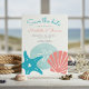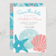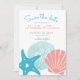 Casamento temático da praia Salve o cartão de datilografia com dólar, estrelas-do-mar (estrela do mar) e conchas marinhas em coral tropical e azul-aqua. O lado inverso é uma casca náutica, cauda de baleia e rodovalho sobre fundo de turquesa. Perfeito para a praia, náutica, costeira, verão, litoral e casamentos temáticos insulares. Trabalho de arte original do KL Stock.