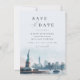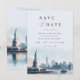 Celebre o seu amor contra o pano de fundo icônico da cidade de Nova York. Este save the date elegante apresenta uma ilustração em aquarela deslumbrante da Lady Liberty e do horizonte da cidade de Nova York. A tipografia bonita e o design minimalista criam um visual sofisticado e atemporal. Perfeito para um casamento de destino ou uma celebração inspirada em Nova York. Personalize o save the date com a data do seu casamento, nomes e uma mensagem personalizada.