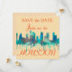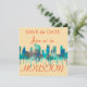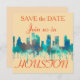 Convites com uma imagem de vidro corado a azul de um horizonte de Houston