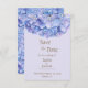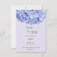 Presilha de Hydrangea Azul de Aquarela Salve a Data. Adorava hídrangas? Então esta design é perfeita para o seu grande anúncio. Belíssima exposição de grandes e belas lavandas e hidrelétricas azuis com pequenas pérolas brancas assentando nas pétalas. Fácil de editar com todas as suas informações de grandes dias.