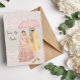 Uma elegante ilustração de um casal indiano em seu casamento, a noiva parece muito bonito a rosa e o noivo segurando um guarda-chuva com um fundo de rendas cor-de-rosa pincelado inclui personalização.