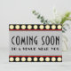 Esta foto retrorreflectora inteligente e divertida salva a data com uma marca de filme com a vintage retro typografia que diz "Chegando em breve em um lugar perto de você" na frente, e uma cortina de filme vermelha revelando sua própria foto no verso. O texto de trás lê seu nome de filme, "dia de abertura" e "horários de exibição". Esta diversão, salvar a data, vai chamar a atenção dos amigos e da família!