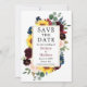 Moderno Elegante Watercolor Floral Save O Cartão de Datas inclui rosas burguentos, rosas cor-de-rosa, flores azuis, flores vermelhas, girassóis, folhas de eucalipto e folhagem botânica verde numa moldura dourada. Foto de volta.