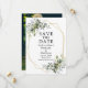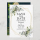 Verde Botânico Elegante moderno Salve a Data O Cartão inclui folhas de eucalipto, folhagem botânica verde, folhas azuis empoeiradas e outro belo verde botânico. Dourado quadro geométrico. Foto de volta.