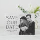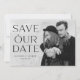 Trendy, elegante salve os anúncios de data mostrando sua foto de noivado horizontal favorita com "Salvar nossa Data" em uma sobreposição de texto preto empilhado com uma letra de anel de diamante "o". Personalize a frente da foto e salve o cartão de data adicionando seus nomes, data de casamento e cidade/estado. A parte traseira da placa apresenta um plano de fundo preto sólido ou muda para uma cor de sua preferência.