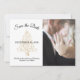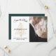 Peça aos seus convidados para salvar a data do seu casamento com este design simplesmente elegante que apresenta a sua foto, o seu roteiro moderno, o texto preto e uma árvore de Natal dourada. Personalize-o com sua foto, data do casamento, nomes e localização. Um fundo verde esmeralda está na parte de trás do cartão.