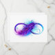 Símbolo infinito com uma bela pena pintada em cores roxas e azuis brilhantes sobre fundo branco.