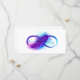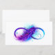 Símbolo infinito com uma bela pena pintada em cores roxas e azuis brilhantes sobre fundo branco.