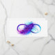 Símbolo infinito com uma bela pena pintada em cores roxas e azuis brilhantes sobre fundo branco.