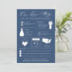 Este infográfico salva a data apresenta fatos divertidos sobre o casal noivo para que eles possam compartilhar sua história com convidados de casamento. O verso tem uma foto de cheio da noiva e noiva. Personalize as cores para combinar as cores do seu casamento! Mova a estrela do mapa para a sua localização de casamento.