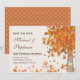 Personalize estes belos cartões de salvar a data no tema outono e anúncios de casamento com a data do seu próximo casamento. Uma bela árvore com folhas em forma de coração pode ser personalizada com as iniciais do noivo e da noiva na frente destes anúncios. Suporte de coração laranja. Arte © Chrissy H. Studios, LLC. Todos os Direitos Reservados.