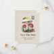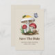Salve o tema chá de fraldas Date com ilustração de dois cogumelos cercados por borboleta, inseto, insetos e caracol.