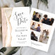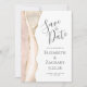 A borda esquerda deste elegante casamento moderno salve o cartão de data apresenta uma borda agitada com coloração d'água marfim aparada com falso brilho dourado. O texto personalizável combina a escrita manual de cinzas de carvão, as fontes em copperplate e itálico em um fundo branco. O verso fornece espaços para 5 fotos (3 horizontais 1 quadrado e 1 vertical) e espaço para o seu site de casamento URL ou outra mensagem breve.