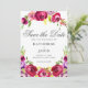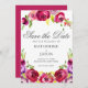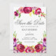 Lindas flores cor-de-água cor-de-rosa brilhante decoram este romântico e moderno cartão "Salve a Data" para uma cerimônia de verão em um jardim. O encantador roteiro cursivo é enquadrado por uma foquísia vibrante e buquê floral roxo de rosas.