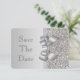 Cartões elegantes personalizados de prata para data de casamento "Save the Date" com um lindo padrão de lantejoulas prateadas impressas, um lindo laço e fita prateados impressos e uma bonita joia de diamante cintilante impressa. Esses cartões planos sofisticados, glamorosos e da moda são decorados em ambos os lados. Convites lindos, elegantes, modernos e na moda. POR FAVOR, NOTE: São gráficos impressos planos - sem laços, lantejoulas ou partes em relevo reais. O texto, a fonte e a cor da fonte podem ser personalizados. Se precisar de ajuda para personalizar o seu produto, entre em contato comigo através da minha loja. Estou à disposição para ajudar. Tenho produtos correspondentes na minha loja.